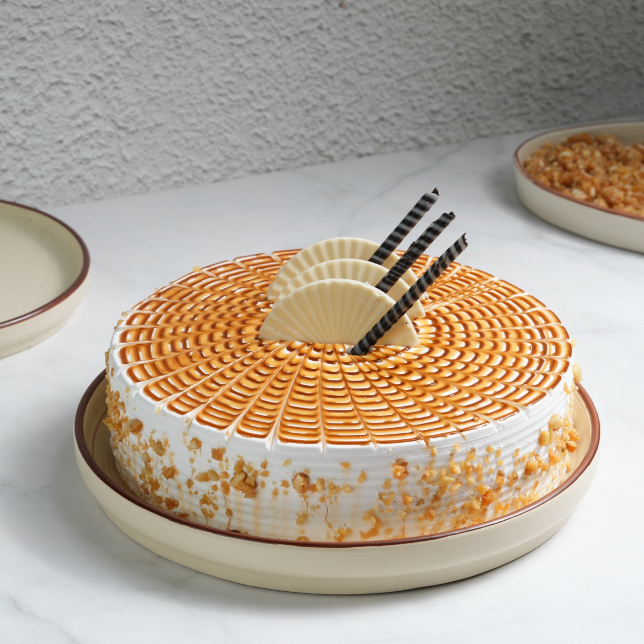 Buttery cake layered with sweet butterscotch cream and crunchy caramel.